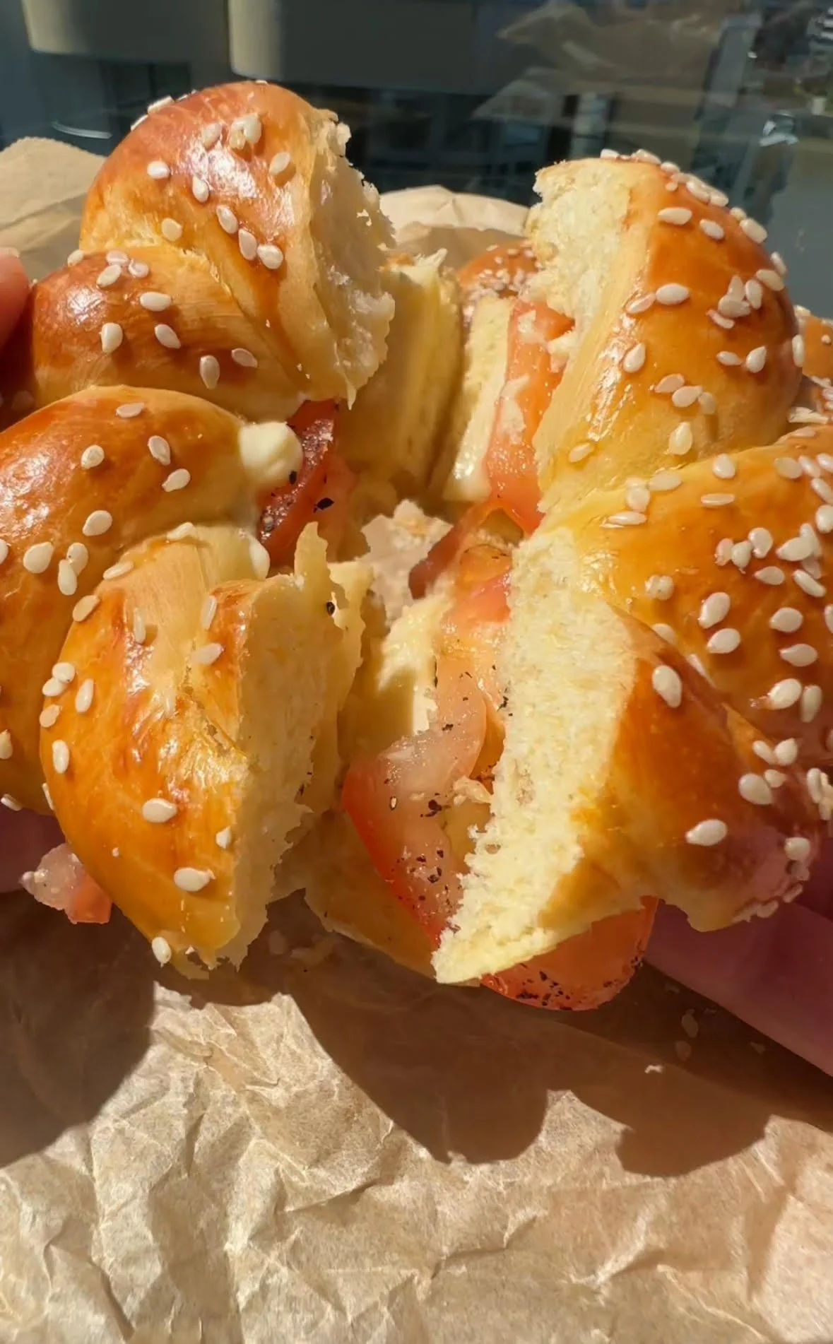 After resting, gently brush with egg wash and sprinkle sesame seeds. Bake 18–20 min until golden.