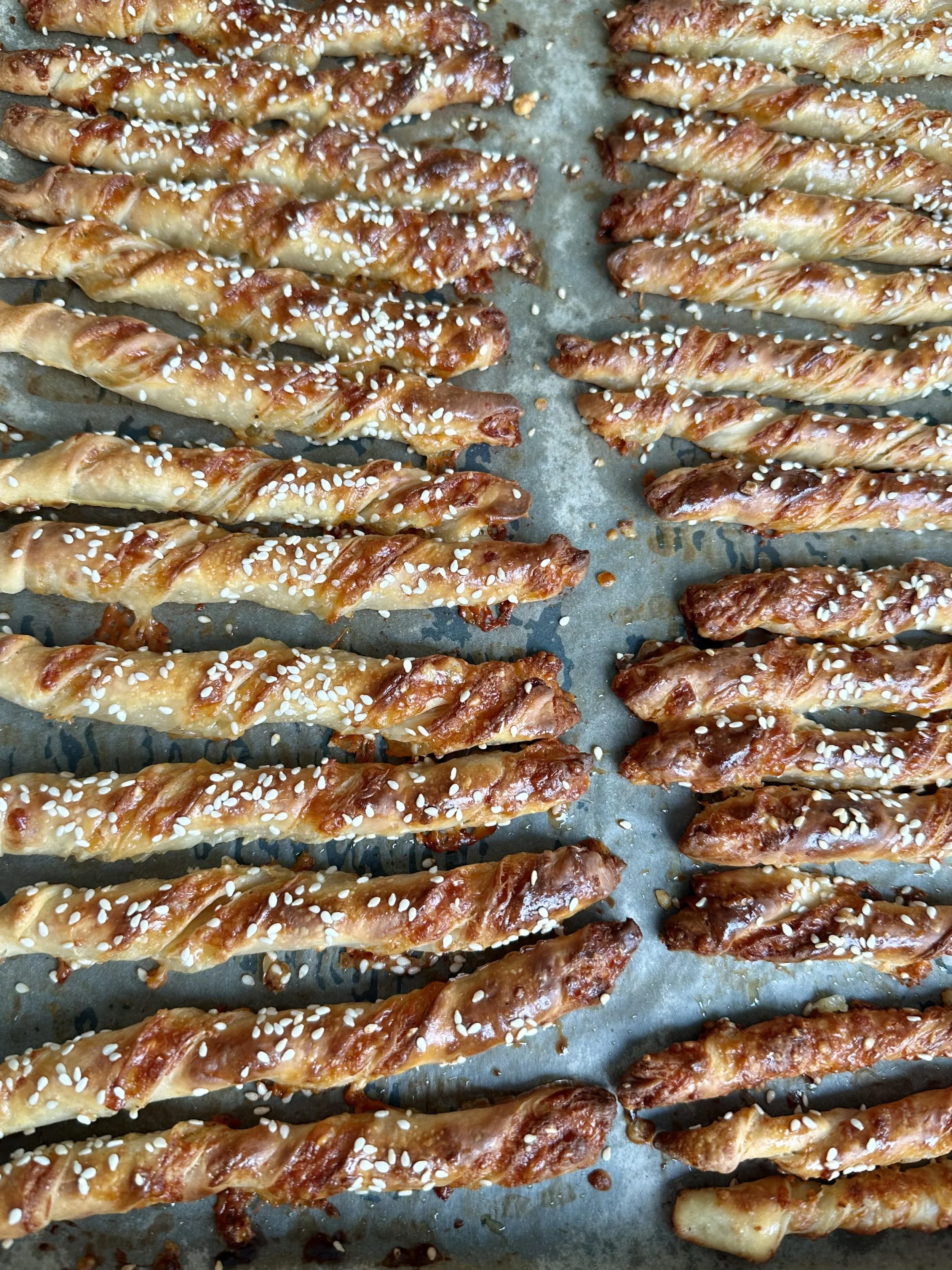 Place twists on a parchment-lined tray, brush with egg yolk mixed with milk, and sprinkle with sesame seeds. Bake 15–20 min until golden and crispy.